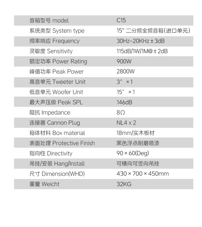 LF:1×15″Voice-coil:100mm HF:1×1.4″Voice-coil:63.7mm |