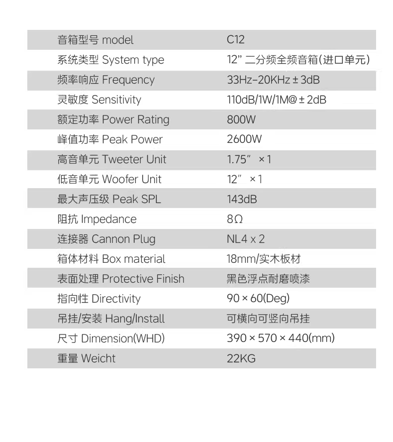 | Enclosure Material | 箱体面网 | 模压钢制网面,外加黑色声学透声布 Molding steel mesh, black acoustic cloth. |